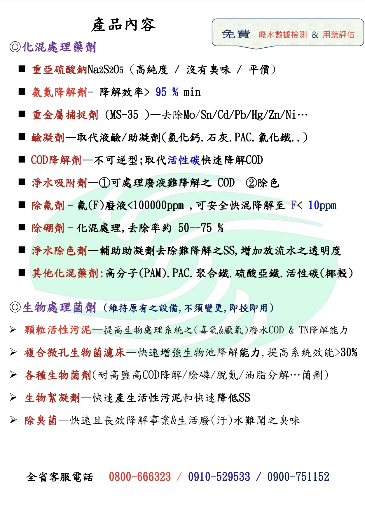 廢水化混處理藥劑 重亞硫酸鈉、純鹼(碳酸鈉)、純鹼(碳酸鈉)、COD降解劑、重金屬捕捉(集)劑 、除色劑 、硫酸亞鐵(一水) 、除硼(B)劑 、硝酸鹽氮降解劑 、鹼凝劑 、除氟(F)劑 、除磷(P)劑 、氨氮去除劑